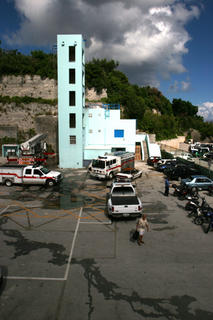 The four days with the Bermudian Firefighters is an experience worth a complete and separate "Blog" entry. Parts of the training were some of the most rigorous I've ever undertaken. After a day of theory we hit the boot camp training facilities including a 5 floor tower complete with a basement where a real fire was set alight and flooded the miniature high-rise with intense heat and smoke. After running up and down stairs, fully suited up in fire gear, gloves, helmet and the 24 lb SCBA set, carrying full 5 gal pails in each hand and arriving at the point of exhaustion, we were led into the black smoke of the third floor and the "cages". We gaspingly entered this maze from hell on all fours, blind and totally dependent on our BA sets. The maze included holes to drop down and others to climb up into. To jack up the excitement a notch, our sets 25% whistles started to blow only half way through this nightmare and panic began its insidious takeover of our sanity.